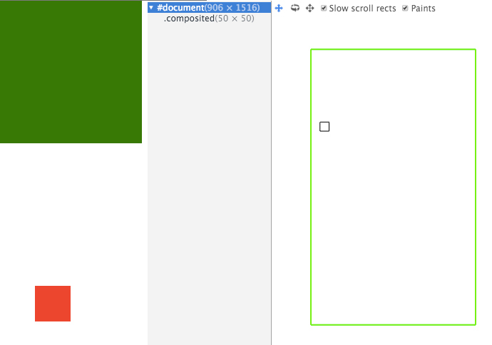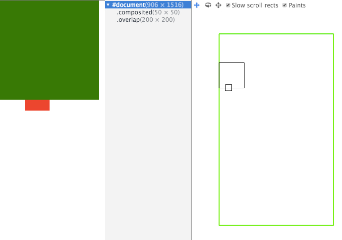 本例中,红色的 `.composited` 提升为了合成层,绿色的 `.overlap` fix 在页面顶部,一开始只有 `.composited` 合成层。  当滑动页面,`.overlap` 重叠到 `.composited` 上时,`.overlap` 会因重叠原因提升为合成层,同时,因为相对于合成层滚动,因此无法被压缩。